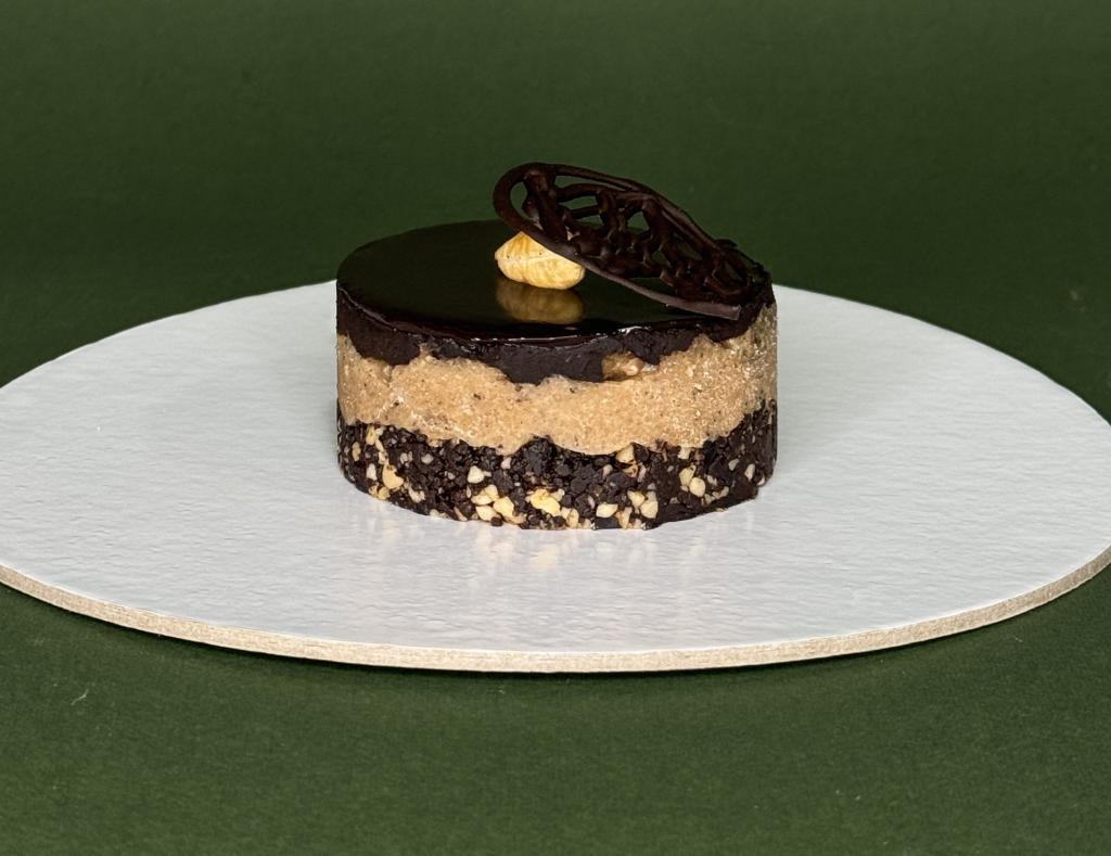 Plazma keks, lešnik krem, čokolada i šećerne mrvice.