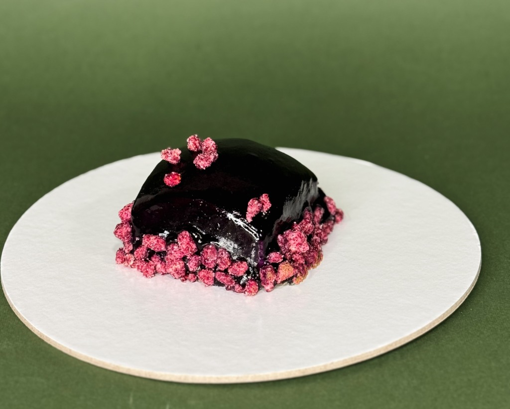 Maskarpone krem sa voćnim punjenjem od kajsije i borovnice obložen hrskavim bademom