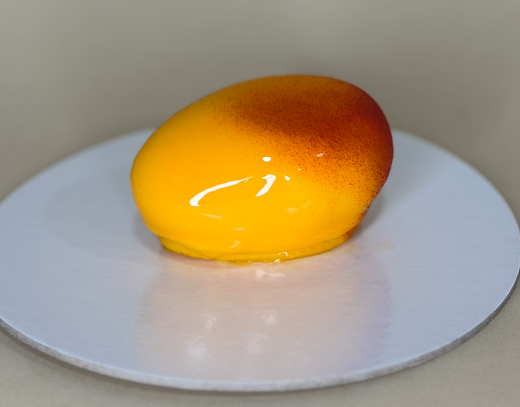 Osvežavajući mango krem, sočne žute korice, sjajni preliv i mango komadići