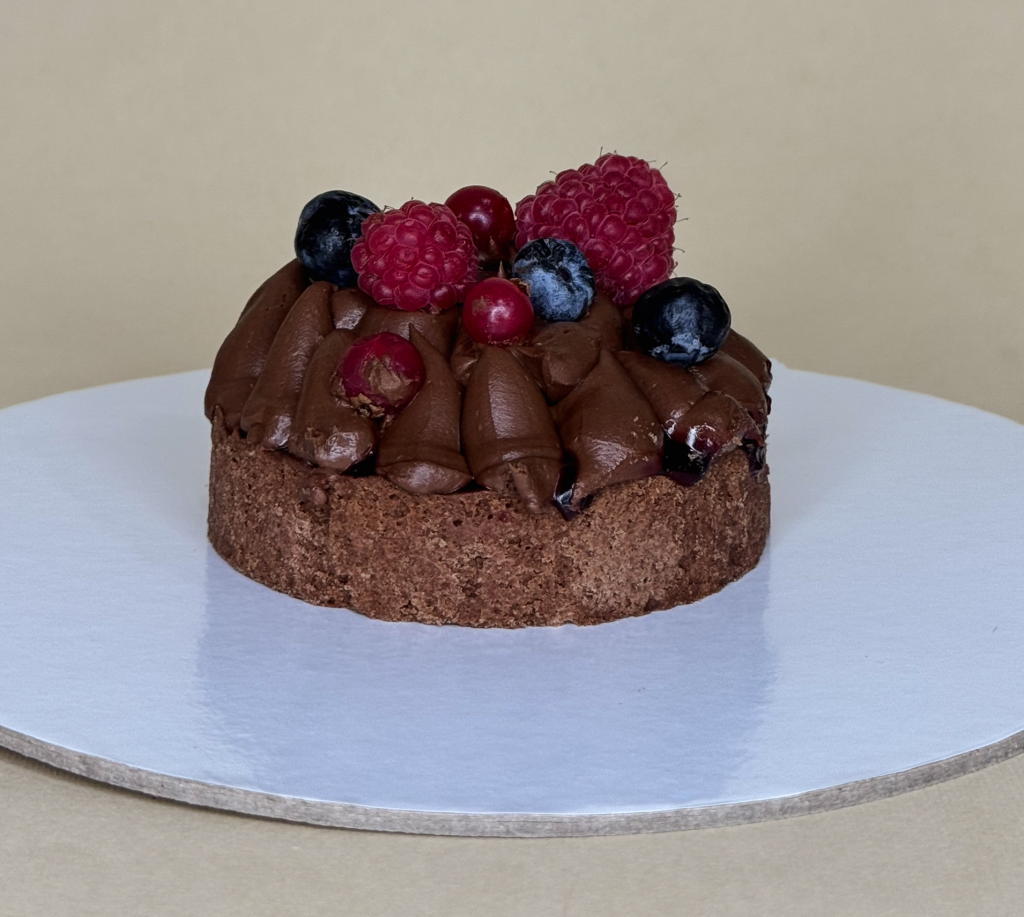 Intezivna crna čokolada u kontrastu sa svežim voćem na hrskavoj vegan tart korici
